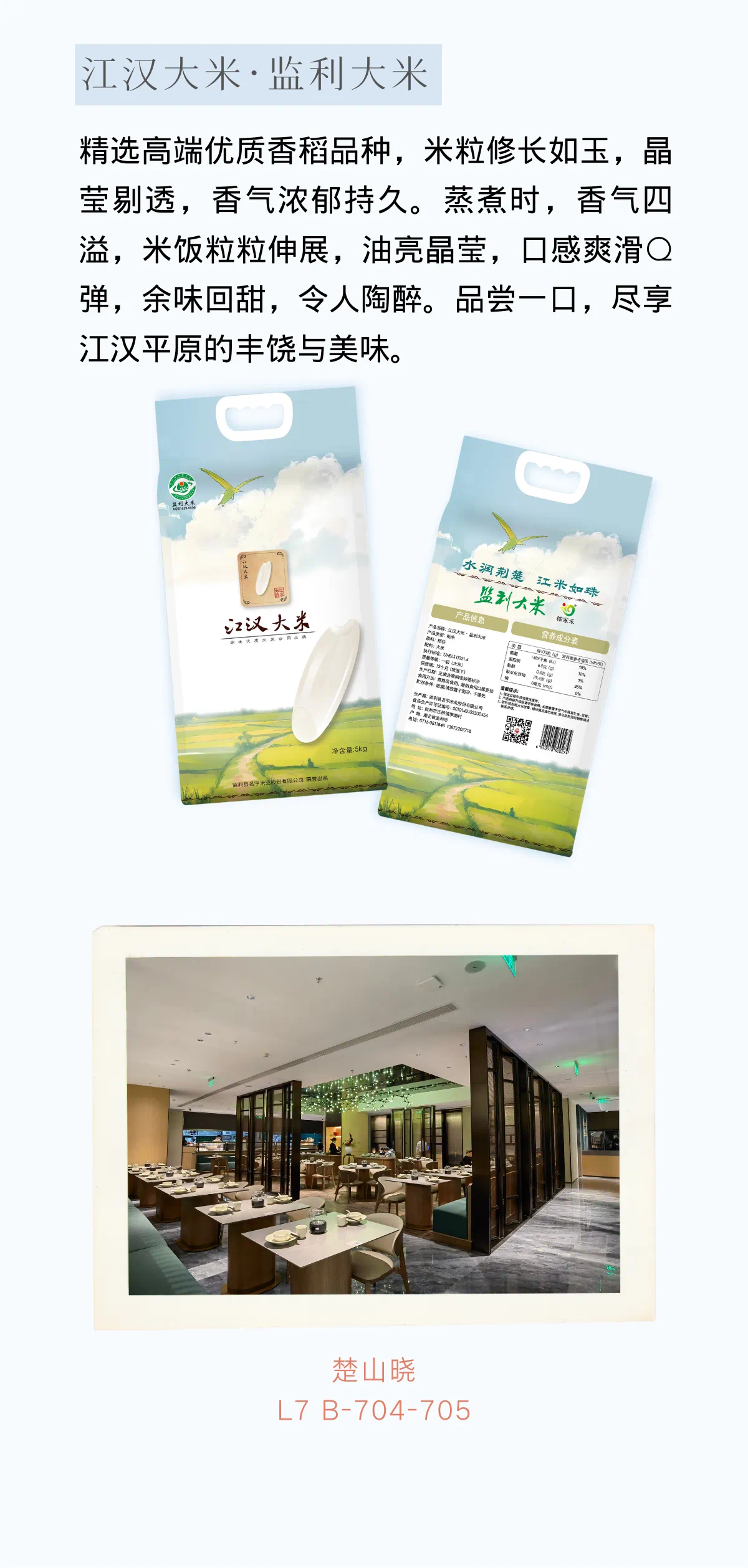 監(jiān)利市地處江漢平原腹地,北緯30度,屬古云夢澤地帶,南靠長江,北依漢江東荊河,東擁洪湖,水資源豐富,土地肥沃,氣候適宜,是天然生產(chǎn)優(yōu)質(zhì)稻米的大糧倉。監(jiān)利大米以獨具特色“米粒細(xì)長、晶瑩剔透、軟而不糯、粘而不膩、富有彈性、清香可口”而著稱。 這款“江漢大米·監(jiān)利大米”優(yōu)選江漢大米主推優(yōu)質(zhì)香稻品種--華夏香絲,米粒細(xì)長,晶瑩剔透,香味濃郁,留存期持久。蒸煮米飯香味飄拂,米粒伸延,晶瑩油亮,顆粒鮮靈,食來爽滑柔順,Q彈有嚼勁,飯味豐足,回甜綿長。